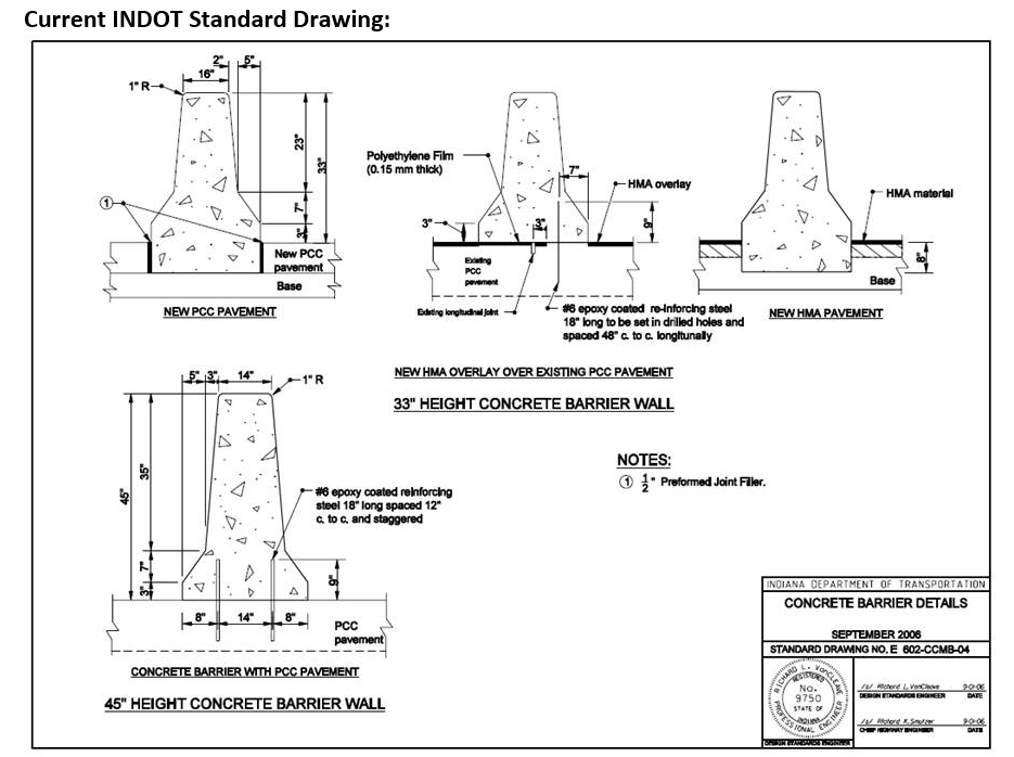 INDOT standards allow two options either anchor into an existing concrete pavement or counter sink the base of the median wall between two shoulders, a picture of the Current INDOT Standard Drawing is shown below.