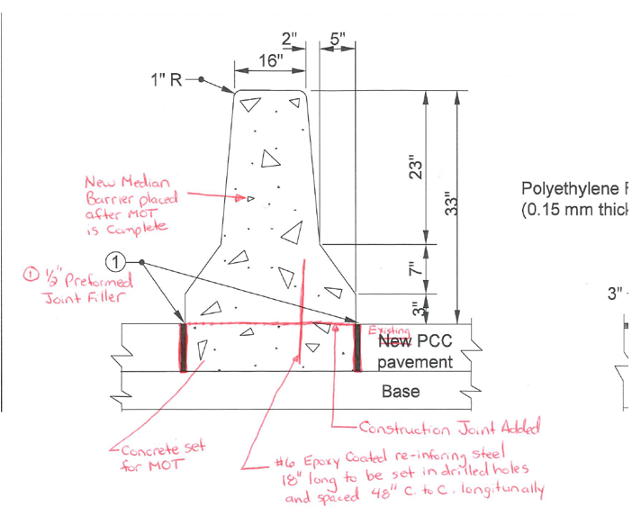 Existing mainline & shoulders consists of 12in concrete pavement. The proposed median depth would match the depth of existing pavement matching the ‘new pcc pavement’ barrier cross section detail (with the exception of the construction joint)