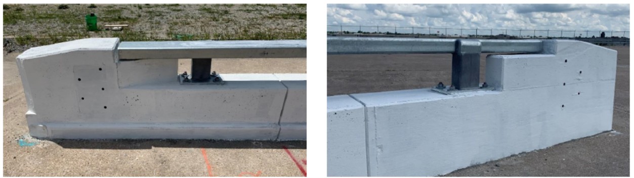 We believe that because the vertical rails are recessed from the main curb face of the barrier, a 10:1 horizontal transition may not be necessary to prevent snagging.